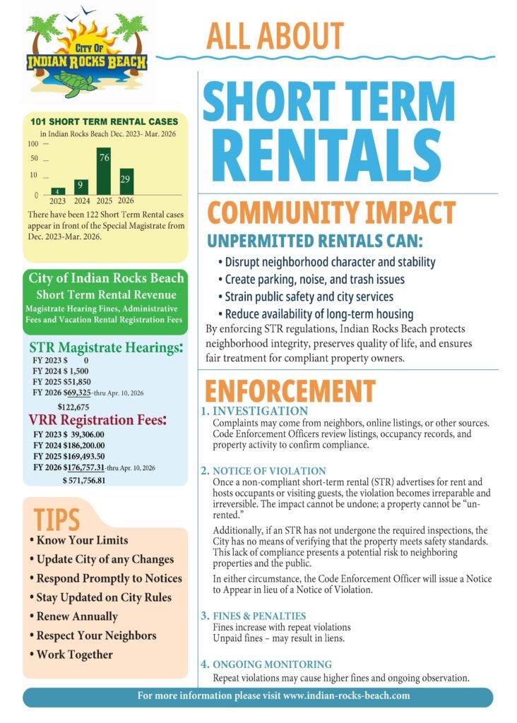 The following information regarding short-term rentals is intended to provide the essential information which property owners in the city of Indian Rocks Beach need to know regarding owning and managing short-term properties.